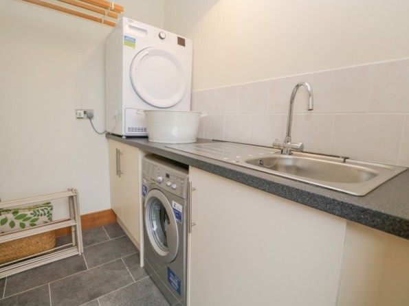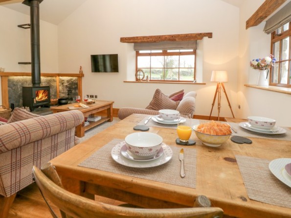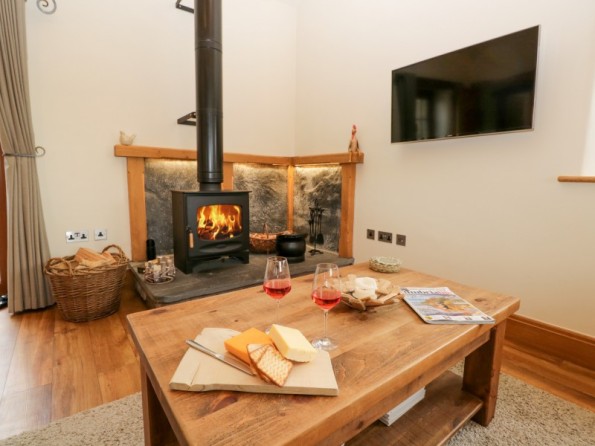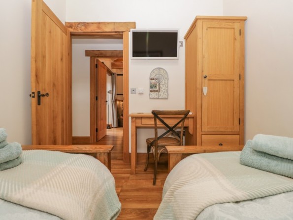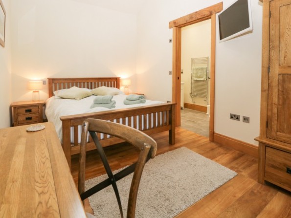 All ground floor. Two bedrooms: 1 x king-size double with en-suite shower, basin and WC, 1 x twin. Bathroom with bath, separate shower, basin and WC. Open plan living area with kitchen, dining area and sitting area with woodburning stove. Utility accessed via the patio.