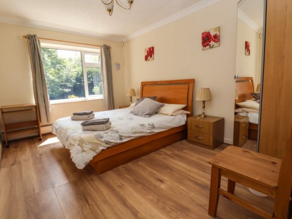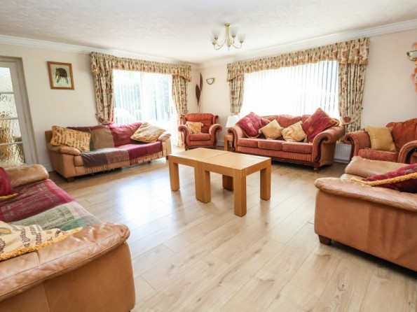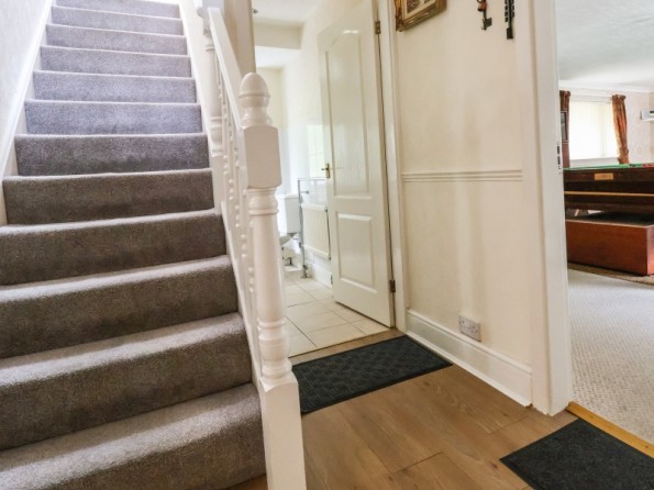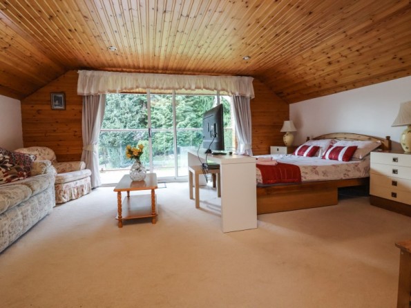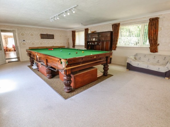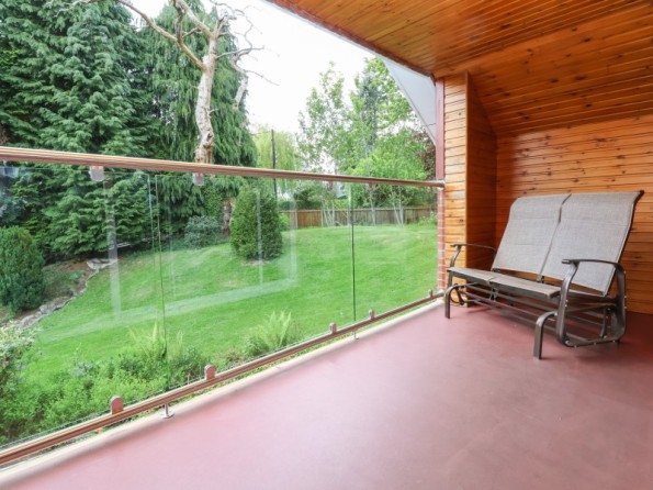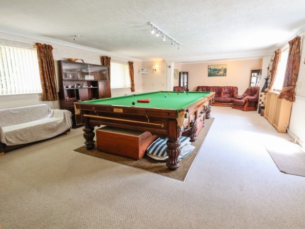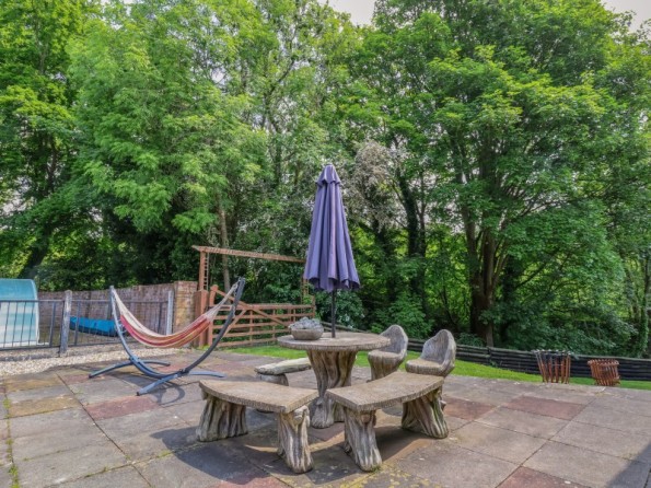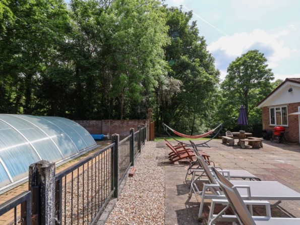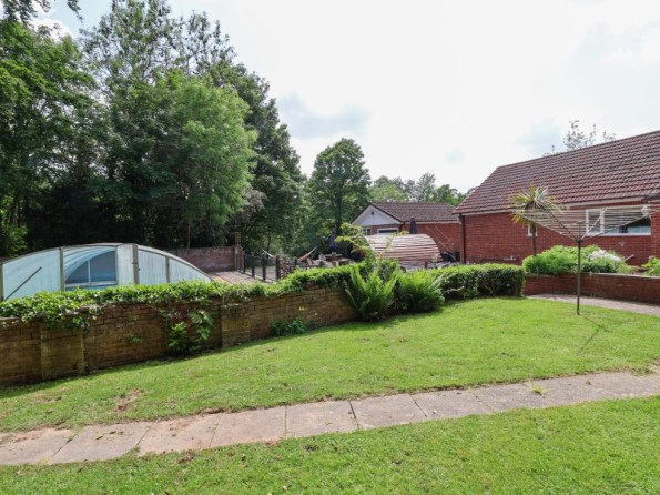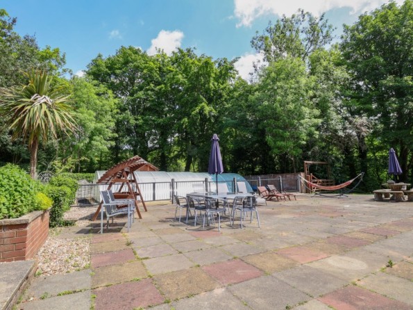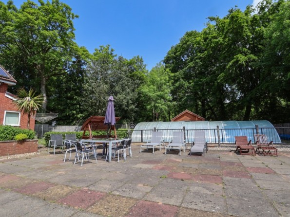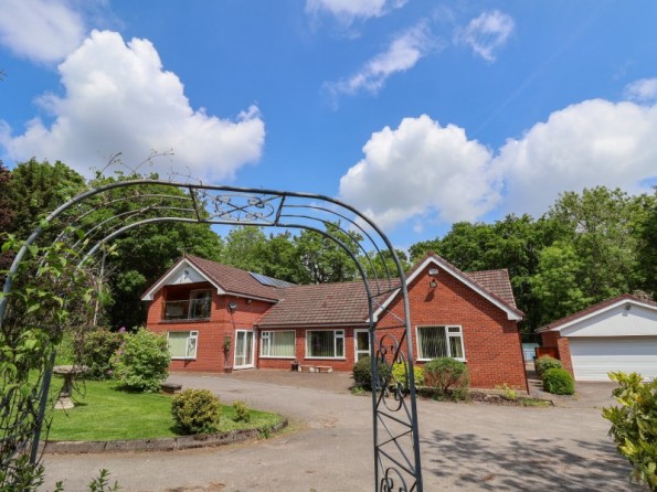 Llys Offa is a detached house in Ruabon, five miles from Wrexham. The property has two king-size and two super-king size bedrooms, with one of each on the ground floor, along with a twin room with pull-out trundle bed. One of the king-size rooms has an en-suite and a balcony, and there are two family bathrooms, one with sauna. There is a kitchen, utility, dining room, sitting room and snooker room. Outside is an acre of grounds with stream, sitting areas, patio, BBQ and heated swimming pool with sliding canopy cover. There is also an external changing block with shower room available in the summer months. There is off road parking for 8 cars. Llys Offa is ideally placed for enjoying North Wales, Chester and Shropshire, in an area full of great walking, biking and spectacular scenery.