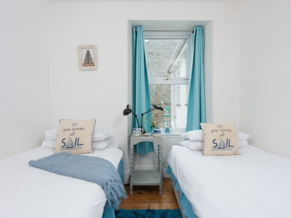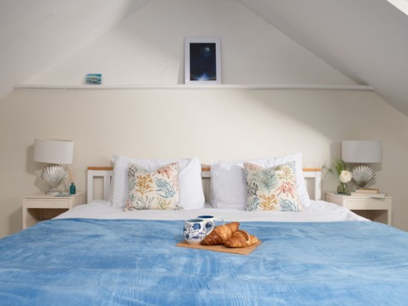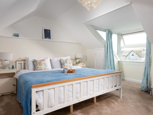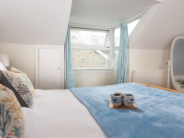 Situated on the top floor this room is bright and light-filled thanks to a large overhead dormer window from which there is a super sea glimpse over the roof tops towards the Gwithian coastline. The room has storage cupboards under the eaves and is furnished with a super king size bed, side tables with lamps, a standing oval mirror and freestanding wardrobe