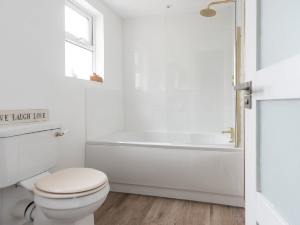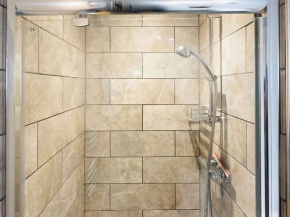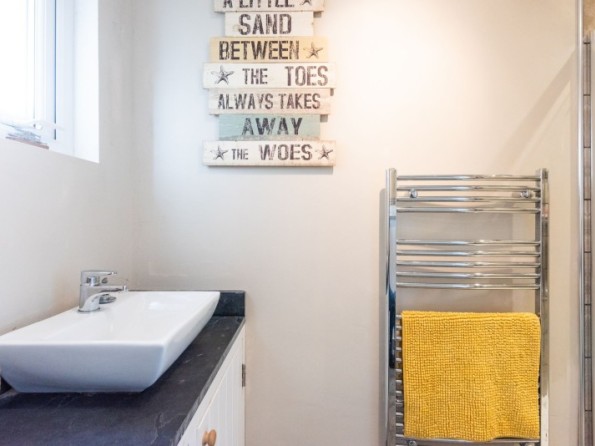 The downstairs shower room is off the kitchen and includes a tiled shower enclosure which has a glass screen, hand basin with cupboards under, WC and heated towel radiator
