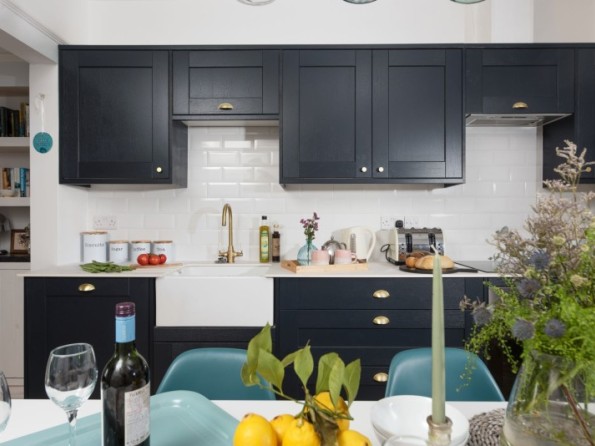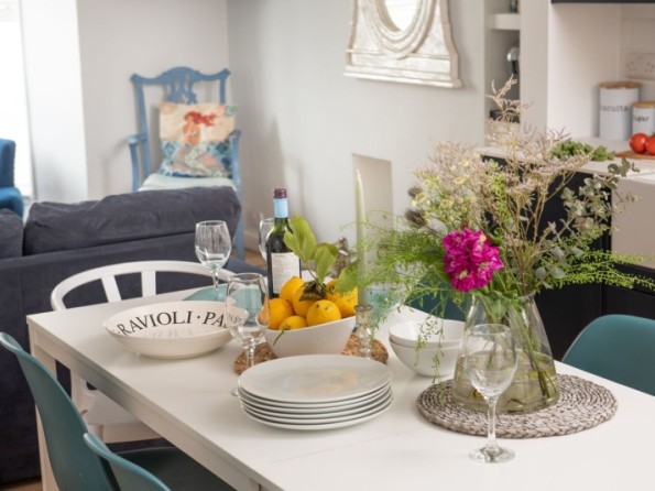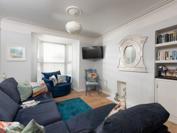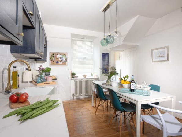 This lovely cottage lies tucked away in the heart of St Ives, just 5 minutes-walk from the harbour, and makes a fantastic base from which to explore the town’s charming streets, restaurants, art galleries and beaches. Recently refurbished, the cottage is laid out over three floors with open plan living / cooking / dining on the ground level and three bedrooms above. Light and airy, the lounge features a bay window and whitewashed floors with a large navy blue L-shaped sofa and 50’s inspired contemporary chairs for relaxing on. When you’re not out exploring, you’ll be able to kick back in front of the television; or gather around the dining table in the kitchen for a bite to eat or to discuss the day’s plans together.