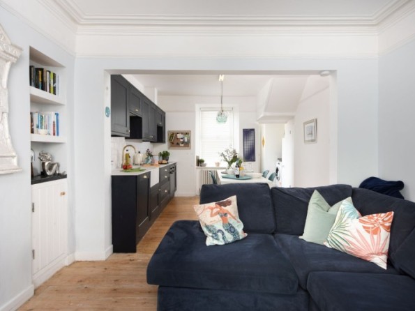 Featuring a lovely bay window to the front, this room is open plan with the kitchen / diner and has a large L-shaped sofa as well as an armchair, bookshelf and side tables