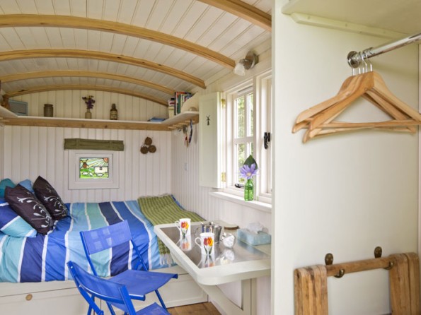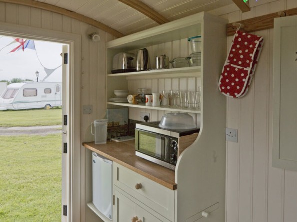The shepherd`s hut is for two people only, and is sited on the main camping field. It is fitted out with a large double bed, wardrobe, large draw under the bed, microwave, kettle, toaster, fridge, radio and a heater, the fitted dresser is also kitted out with utensils and crockery. Also provided is a welcome pack of tea and coffee and a pint of locally produced milk. The main building on the field has the ladies and gents toilets, washbasins and showers, electric sockets for hairdryers and two shaver sockets in the gents. There is an indoor room with two sinks for washing dishes and vegetable preparation, also tourist information. Free hot water for showers and dishwashing.