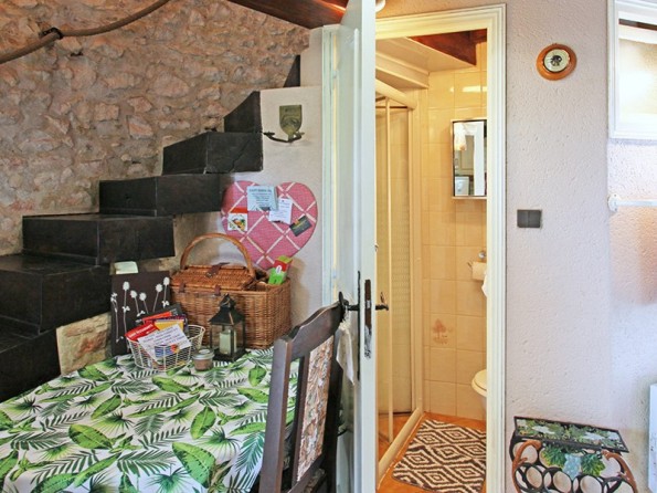 The windmill is made of natural stone which means it is cool in summer and warm in winter. There are French shutters to the windows and doors. For comfort ceiling fans have been added in some rooms. On the ground floor is the kitchen / diner and the shower room. The kitchen is fully fitted and equipped and includes cooker, microwave, large fridge (with small freezer compartment) and washing machine. There is a dining table and chairs here. The shower room has a small under stairs shower and a toilet. The bedroom (a double) is on the first floor and is open plan. The bedroom has a washbasin and under stairs wardrobe / storage area. The lounge is on the second floor. It has comfortable seating and a delightful view over the vineyard to the hillside beyond. There is a TV with DVD player (no satellite or French TV), and a small selection of DVDs, books and games. There is electric heating throughout making the windmill suitable for year-round stays.
