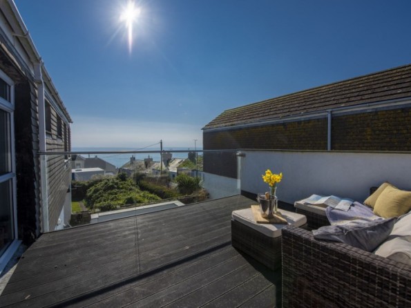 The suntrap upper balcony with glass balustrade and sea views is furnished with a table and seating. There is a second terrace that is accessed through the master bedroom downstairs