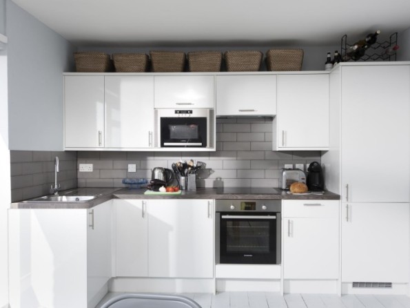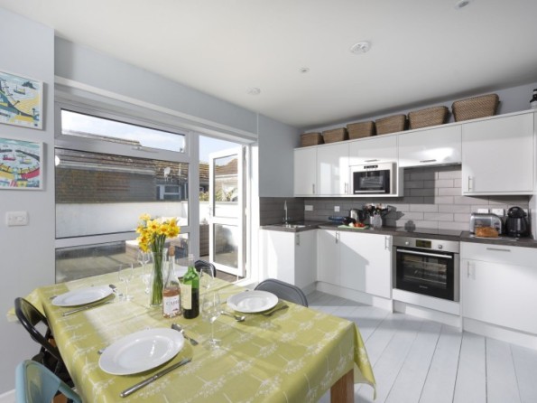 Located on the first floor with access out on to the upper terrace, the kitchen is open plan with the dining area and features a fridge, freezer, washing machine, iron and ironing board, toaster, kettle and microwave