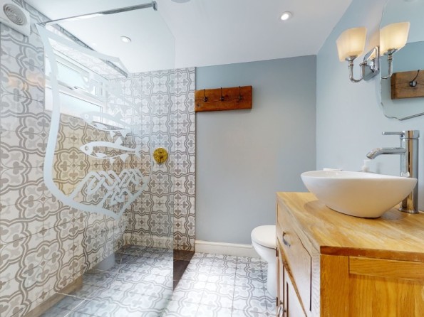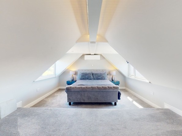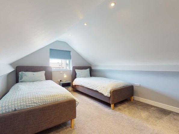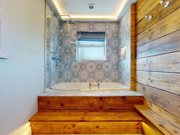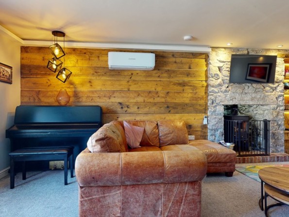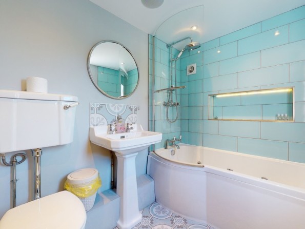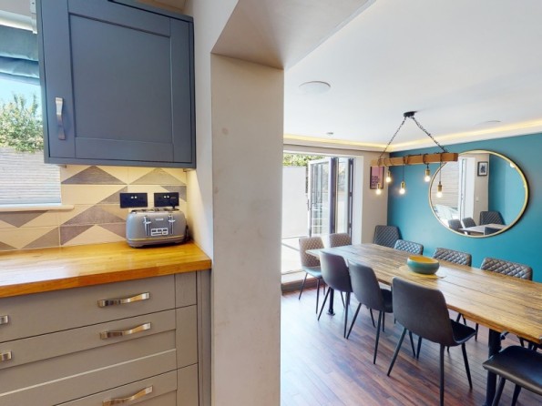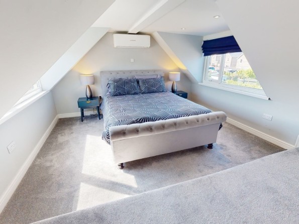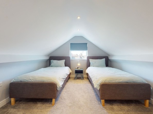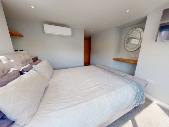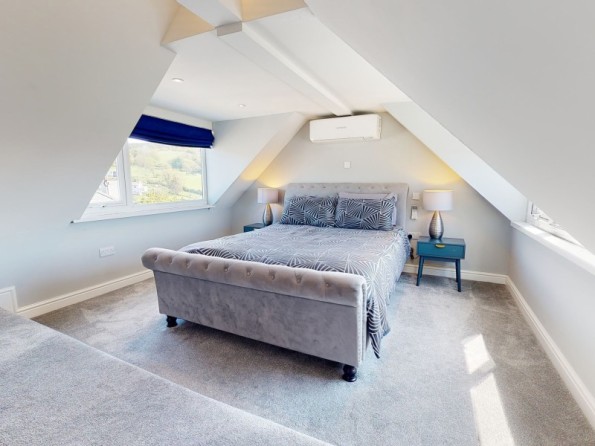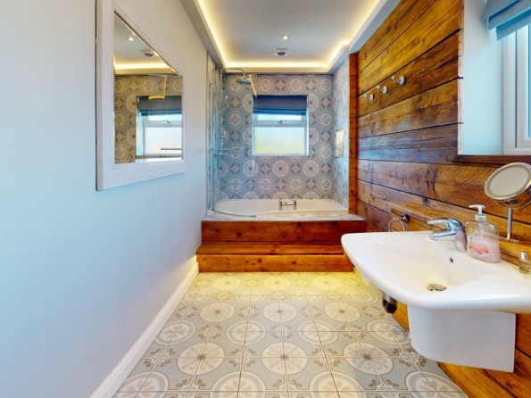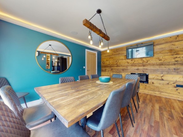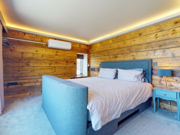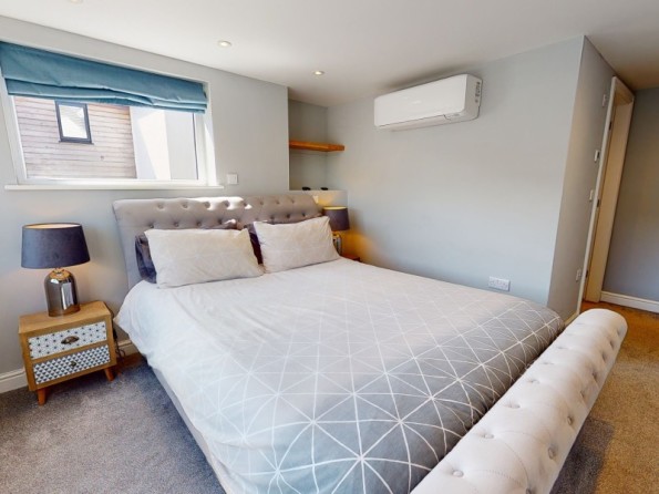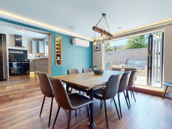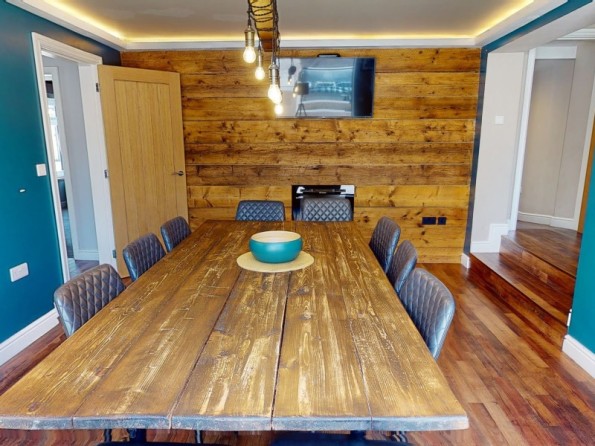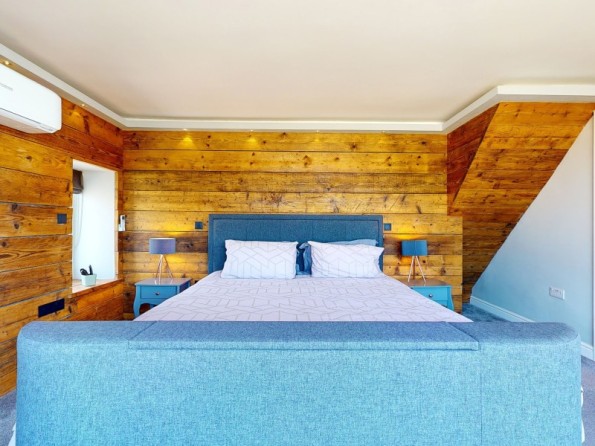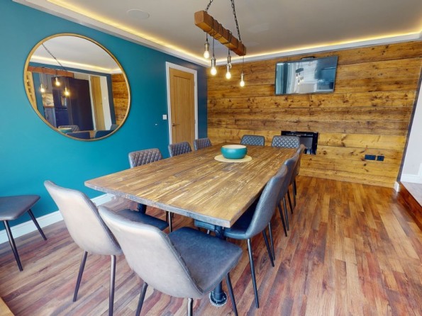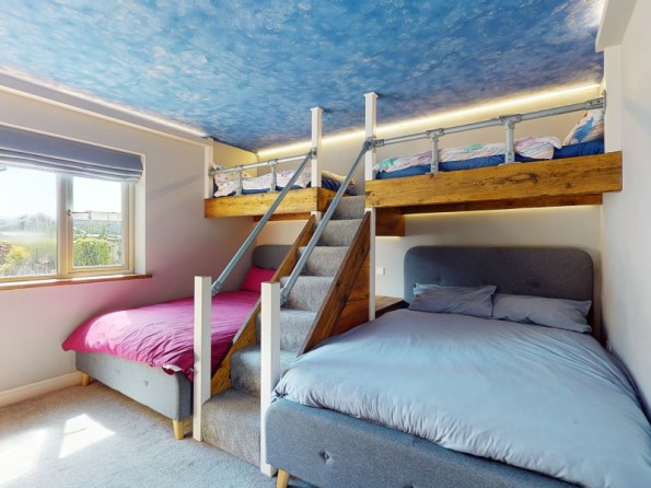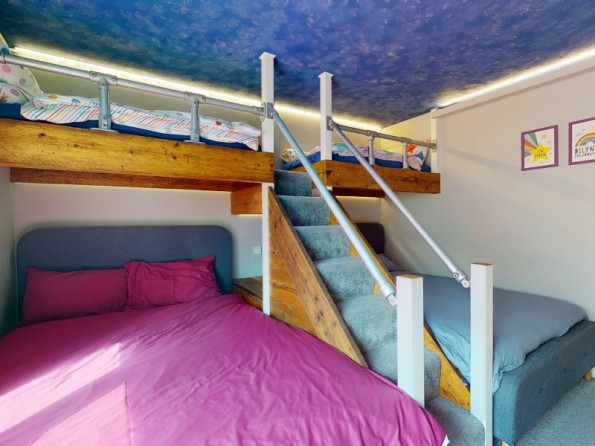 . Three-storey house. Six bedrooms: 1 x children's room with two doubles and two child's bunks over the doubles with Smart TV, 1 x king-size with Smart TV and en-suite Jacuzzi bath, shower over, basin and WC, 1 x Super King with Smart TV and 1 x Double bedroom on the first floor 1 x second-floor king-size with travel cot, 1 x second-floor twin. Ground-floor wet room with walk-in shower, basin and WC. Bathroom with sunken bath, shower over, basin and WC. Kitchen/Diner with a 12 seat table. Sitting room with woodburning stove. Fully Air Conditioned throughout. Note: The maximum number of adults to stay is 14, and 2 children due to the bunk beds only suitable for children up to the age of 10.