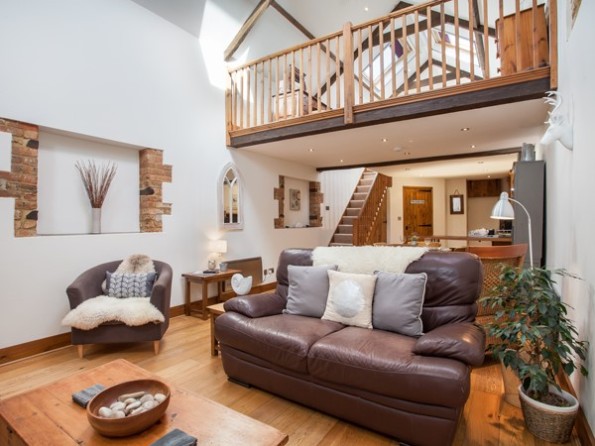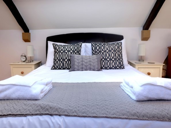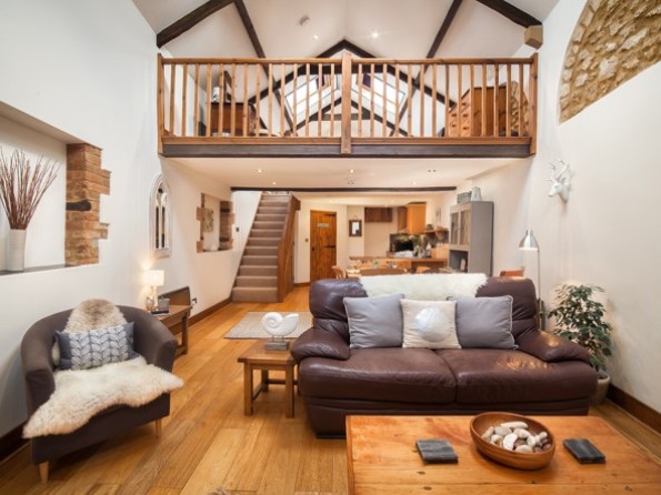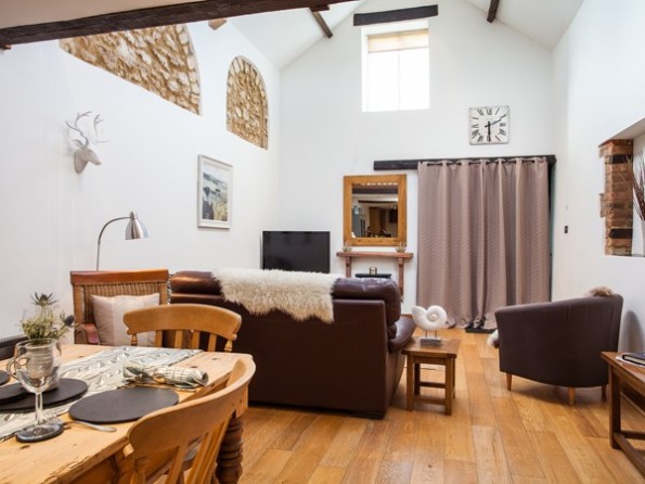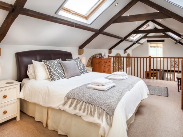Inside, the barn has a huge double height living area with exposed beams and stone arches. There’s a TV / DVD player and wifi throughout. There is a spacious mezzanine bedroom with a king size bed. There’s a well equipped solid oak kitchen and a bathroom with shower. Expect to find a bottle of wine, flowers, tea and coffee, local biscuits and Egyptian cotton bedding and towels.