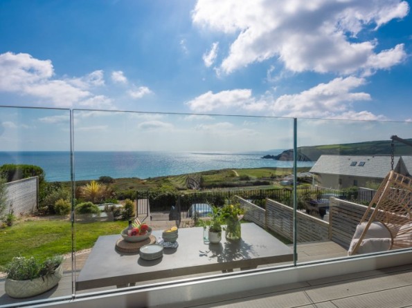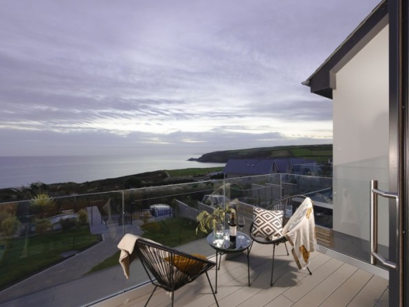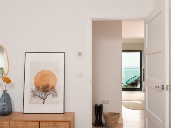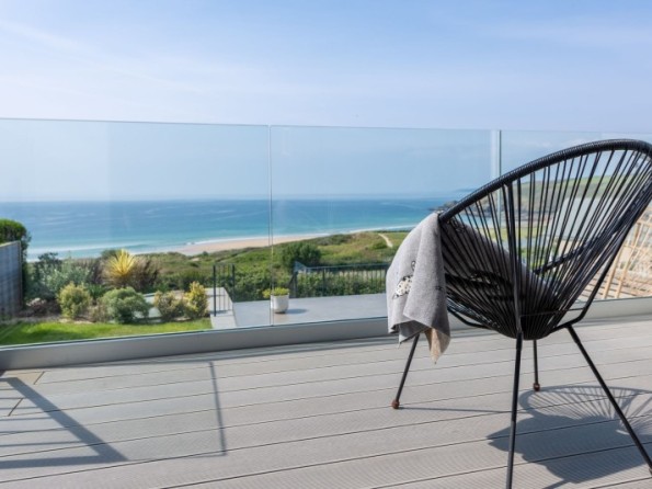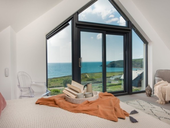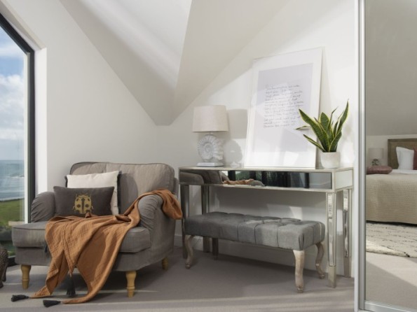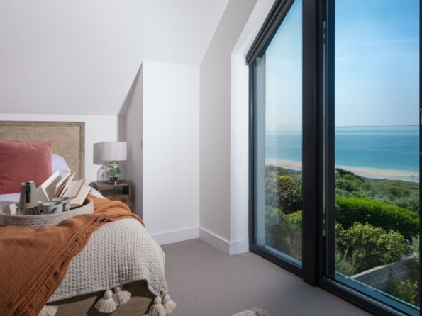 The stunning master suite features a luxury king size bed with spectacular sea views from its double volume apex window and sliding door which opens over a small glass balustraded Juliet balcony. The room is furnished with a built-in wardrobe, dressing table and chair, armchair, two side tables and reading lamps. It also has its own en-suite bathroom.