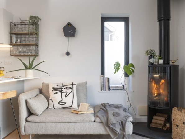 Open plan with the dining area and kitchen, this inviting room features two large sofas and has access via a sliding door to the front terrace. It features a wonderful *wood-burning stove as well as a standing Smart TV and Bluetooth speaker.