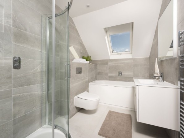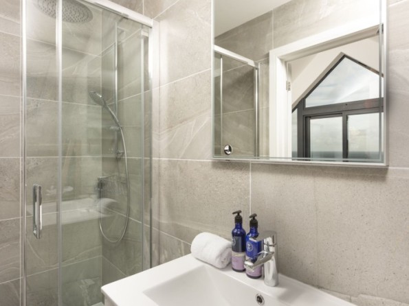 This bathroom is the en-suite shower room to the Master Bedroom and features a large walk-in shower cubicle with a rain head as well as hand-held shower attachment. The room has a wash hand basin, mirror, heated towel rail and WC