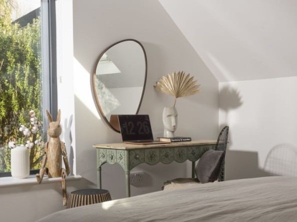 This lovely bedroom features a super king size bed that can be configured to twins on request. The room has a built in wardrobe, a dressing table and mirror and a seating area.