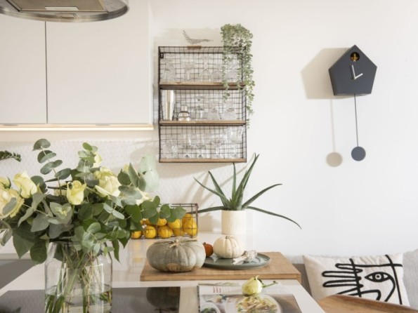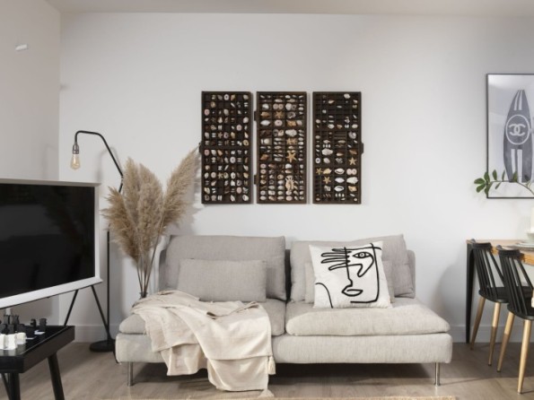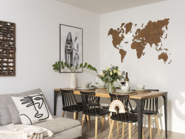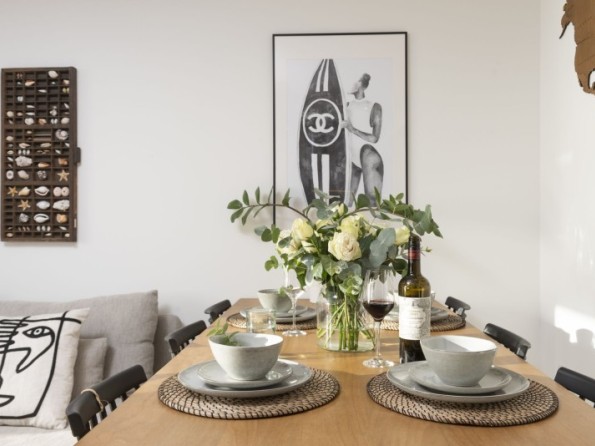 Open plan with the kitchen and living room, the dining area features a large table and seating for 6 guests. This whole space together with the kitchen, has a coastal ambience with natural fabrics and textures creating a cosy, minimalist feel.