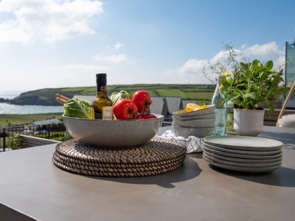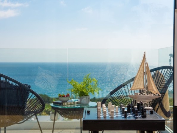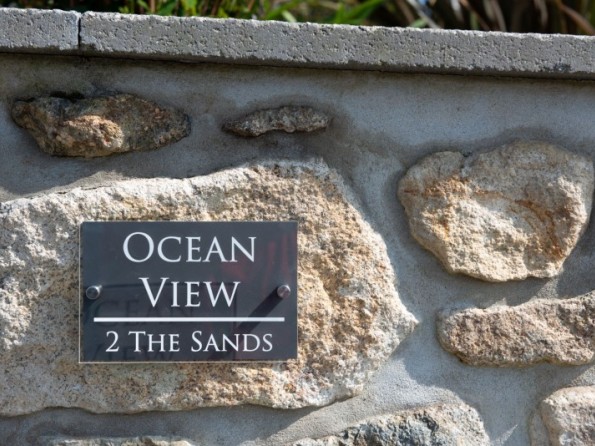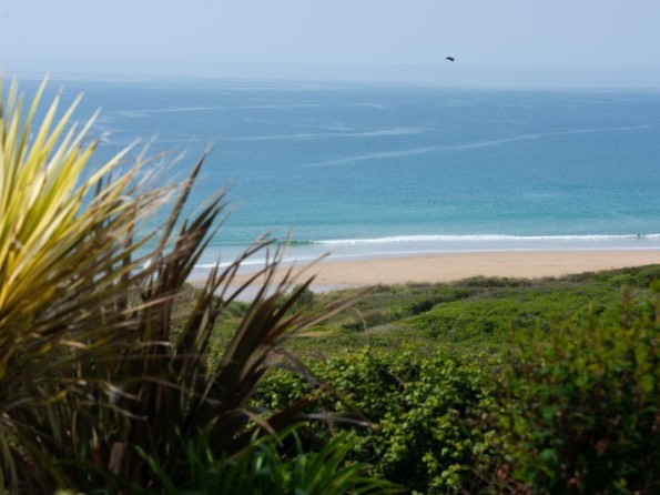 To the front of the house is a landscaped garden with an undulating walkway and mature planting. A decked area on two levels makes for an inviting suntrap, with a small set of stairs leading up to the balcony which accesses the living room. Furnished with a bistro table and two chairs, the balcony is the perfect spot to catch up on a good book or for enjoying your morning coffee. The lower deck is furnished with a rattan swing chair and a modern concrete dining table and benches for an exquisite alfresco dining experience by the ocean.