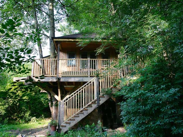 The treehouse is accessed by a set of wooden stairs and it boasts a balcony with a table and chairs.