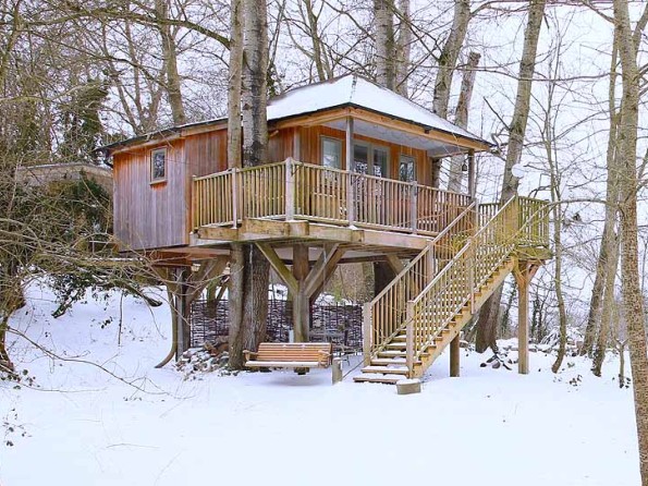 With the comforts of home inside and the charms of nature outside, the Old Mill Treehouse is the perfect place to celebrate a special occasion or to just escape for a few days. The interiors are simply stunning, with hardwood floors, fluffy rugs, crisp white linen and arty touches throughout. The balcony, with its dining table and countryside views, is an idyllic setting for breakfast or a sundowner. And a few minutes’ walk will take you to a delightful 13th century pub which will welcome you with open arms. Whether you want to explore Somerset or just cuddle up with someone you love, this is an enchanting retreat if you want to stay in a treehouse uk. 10 metres away from the Treehouse (but secluded by the trees) is a one bedroom luxury lodge which also sleeps two.