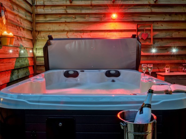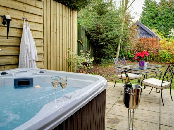 Outside there is a large enclosed garden with a BBQ, dining furniture and a wonderful indoor-outdoor room with a private hot tub. There are other cottages on site, all of which are set within the trees around a pond and a communal decked area.