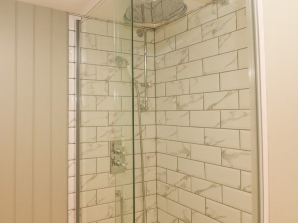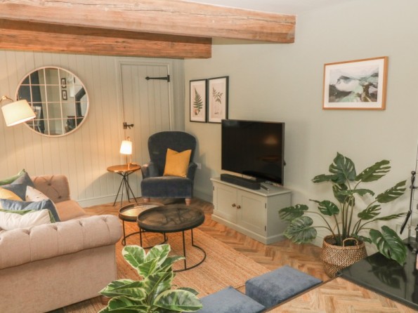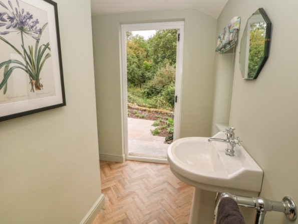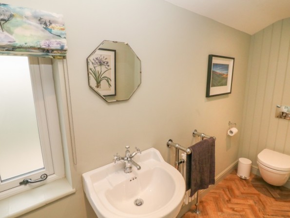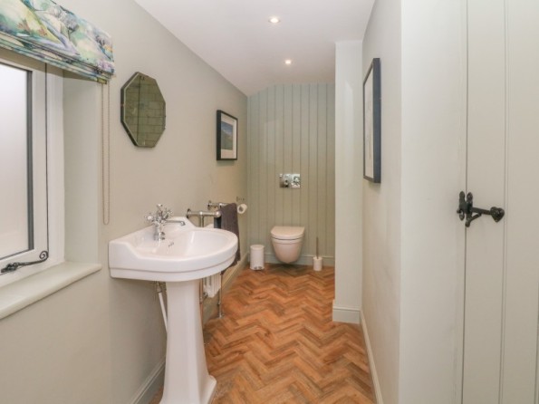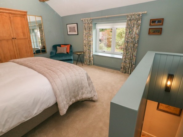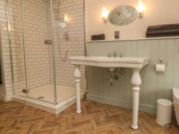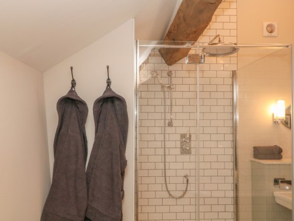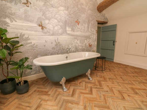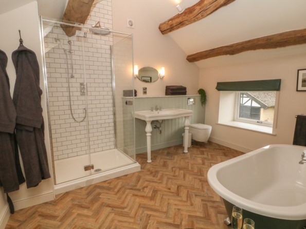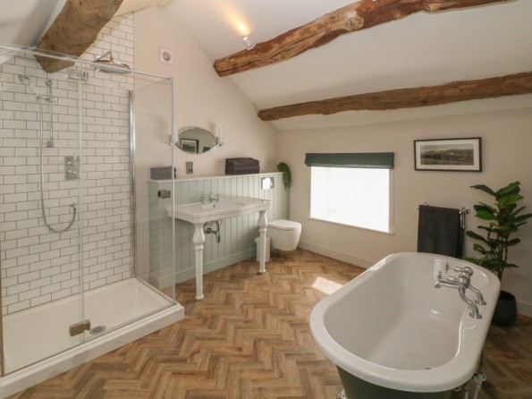 One king-size bedroom with en-suite bathroom with free-standing bath, separate walk-in shower, basin and WC. Ground-floor shower room with walk-in shower, basin and WC. Open-plan living area with kitchen, dining area and sitting room with woodburning stove