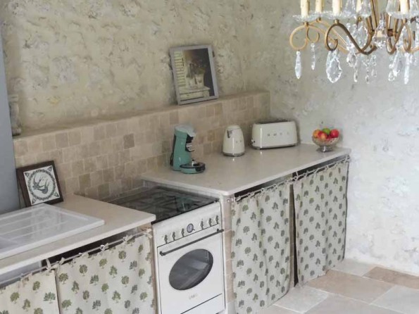 Downstairs there is a spacious open-plan living area with a sofa, a stone fireplace, a limestone floor, antique mirrors and chandeliers and satellite TV. The kitchen area is fitted with retro Smeg appliances and natural stone work surfaces, and upstairs you find a spacious mezzanine bedroom with solid oak flooring and a super king size bed. Attached to this there is an en-suite bathroom with a double sized walk-in shower and a selection of L’Occitane toiletries.
