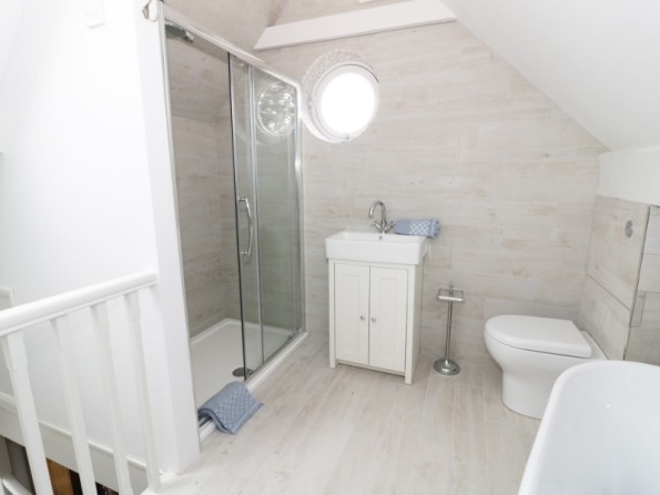 Four bedrooms: 1 x ground floor king-size double with first floor en-suite with slipper bath, separate shower, basin and WC. 1 x king-size double, 1 x twin, 1 x single. Bathroom with bath, shower over, basin and WC. Ground floor wet room with walk-in shower, basin and WC. Kitchen. Dining room. Sitting room with woodburning stove. Hall.