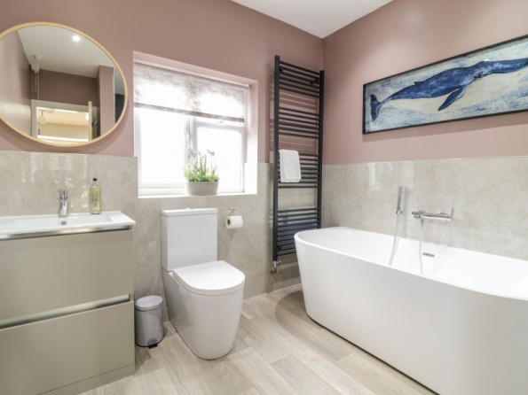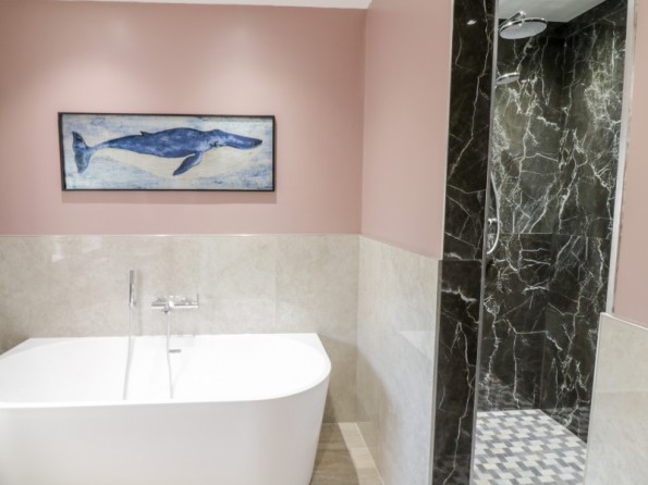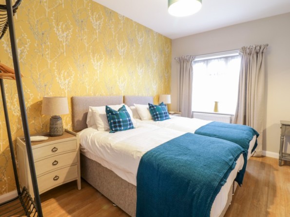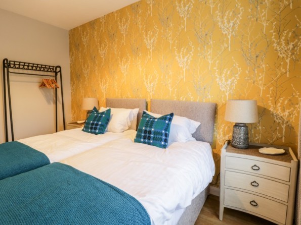 All-ground-floor. Two bedrooms: 1 x twin (zip/link, can be king size on request), 1 x king-size. Bathroom with bath, walk-in shower, basin, heated towel rail and WC. Kitchen. Living/dining room with woodburning stove