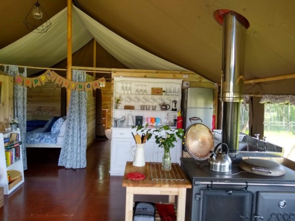 The tent can sleep up to six people and has three bedrooms - a king room, a twin room, and a quirky double cupboard bed which the children will LOVE! There’s a private and spacious bathroom accessed via the king or the twin room. It is divided in two, with a basin and flushing loo on one site, and on the other side a large shower room with a water heating stove. Cooking and heating are via the large wood burning stove in the heart of the tent and lots of firewood is provided. The kitchen is well equipped with crockery, cutlery, pots and pans etc. There’s a small fridge freezer and an electric hob if you want to heat something up quickly without using the wood stove. There’s a large table and chairs with ample space for everyone. The sitting area has comfortable seating for chatting and relaxing. There’s LED lighting and a couple of electrical sockets where you can charge a phone or laptop. Although there’s no WiFi, there’ a good 4G signal on the farm if you need to stay connected.