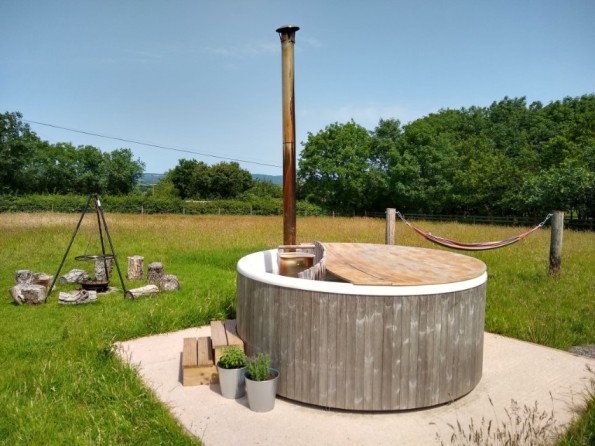 Each tent has a large fenced deck area with hammock, firepit / BBQ area area, comfy seating, picnic table and a wood fired hot tub. This is one of three safari tents with amazing views onto Exmoor. You can't see the play areas from these lodges so they're lovely for couples glamping, or families with older children. The hot tubs are an optional extra which you can select when booking. They are large hot tubs, perfect for up to six guests. The tents are right on the edge of Exmoor International Dark Sky Reserve so the hot tub is the perfect place to relax and watch the shooting stars on a clear night!