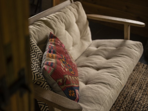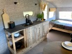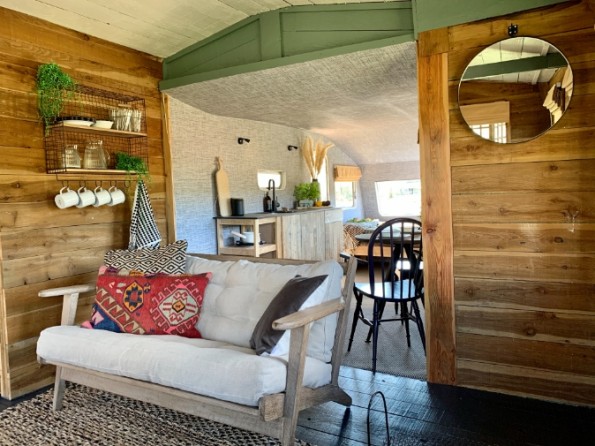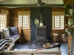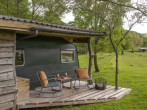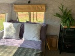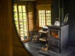 The cabin can sleep up to three people in one bedroom and with the additional use of a daybed. The wooden part of the cabin is home to the Esse Bakeheart stove-cooker (unlimited logs provided), a sofa, a daybed and a little reading corner. The cooker has a hot plate on top, and oven at the bottom, and the fire itself for flame grilling, as well as for keeping you warm. The kitchen is well equipped with a cold water tap, basic crockery and utensils, and a cool box (but no fridge). In the vintage caravan part of the cabin is the cosy double bed (please note, it’s a small double 6ft x 4ft) with river views. There’s under bed storage and a chest of drawers. The living room sofa doubles up as an extra single bed (please ask for bedding if required). There is a dining table which seats up to three people. There is a high tech eco toilet just outside the cabin for your private use. There is no shower at the hut, but the Wash House is a four minute walk away with shower, flushing toilet and washing facilities. Lighting and USB charge points are powered by solar, so please use sparingly. There is no wifi, but 3G / 4G available for most networks.