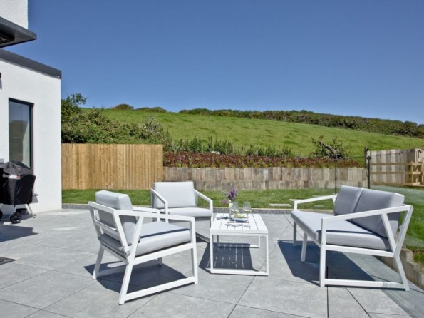 Enclosed garden with two furnished patio areas and sea views
