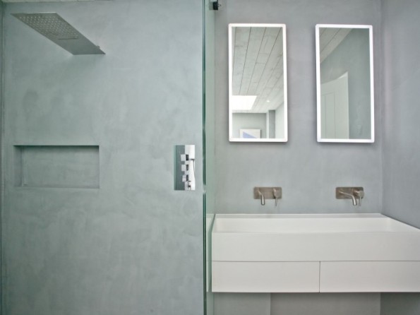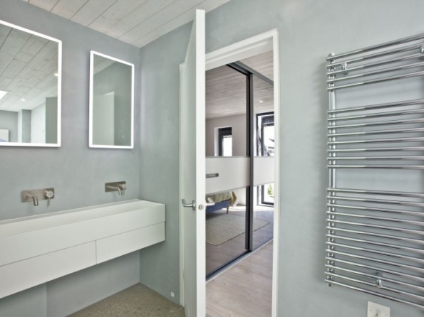Bath, shower cubicle, double hand basins, heated towel rail and WC