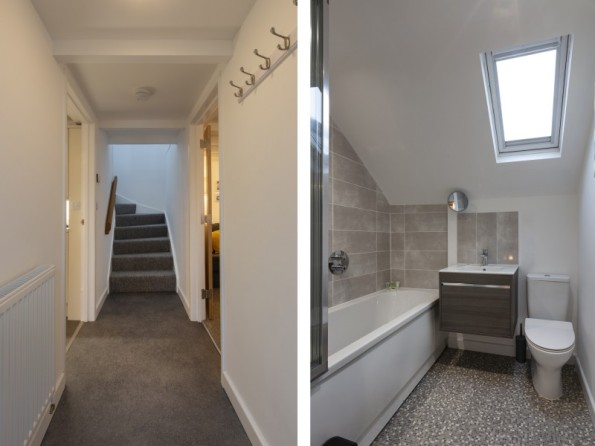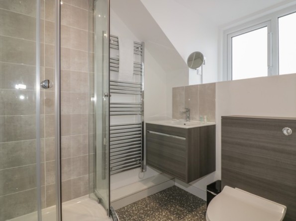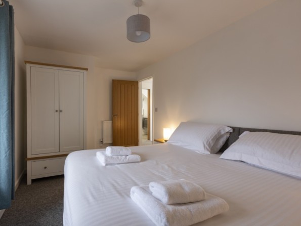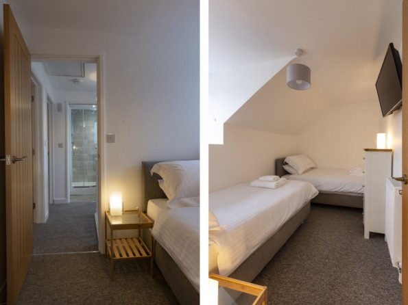 Three bedrooms: 1 x super-king-size bed (can be two singles with zip link) with TV, 1 x kingsize with TV and en-suite shower over bath, basin and WC, 1 x twin with TV. Shower room with walk-in shower, basin and WC. Kitchen/diner. Sitting room with woodburning stove