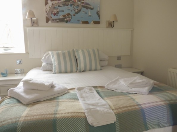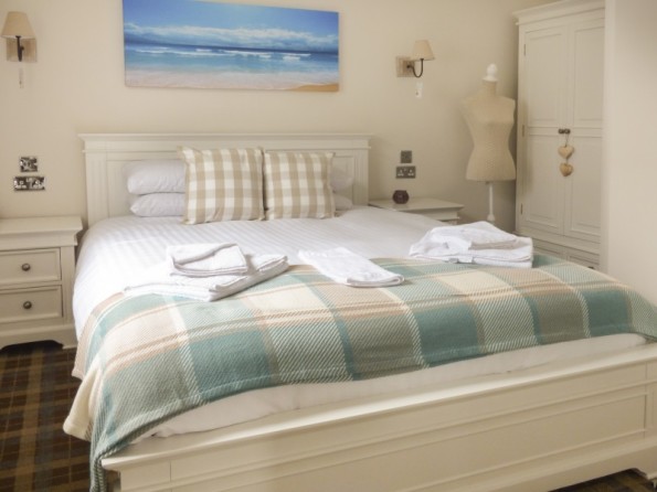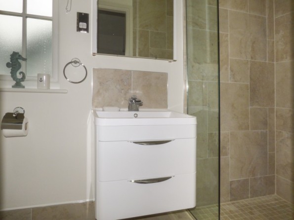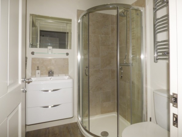 All ground floor. Two bedrooms with TV: 1 x double with TV and en-suite shower, basin and WC, 1 x twin (zip/link, can be king-size double on request) with Jack-and-Jill access to shower room. Shower room with shower, basin and WC. Open plan living area with kitchen, dining area and sitting area with woodburning stove.