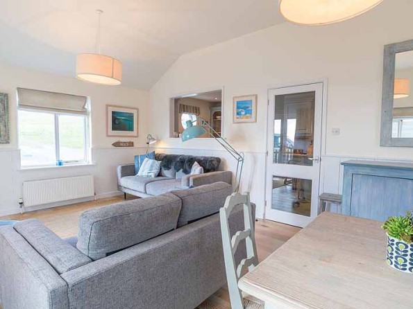 The bright but warm interior will lift your spirits at the beginning and end of the day with a comfortable living room where the day ahead can be planned or happily remembered. Two good sized sofas are a comfortable place to sit and do this and there is a TV and DVD player available too. The open design of the place mean that the kitchen looks out on the sitting room and the kitchen itself is fully equipped with an electric cooker, a microwave, fridge freezer, dishwasher, and washer-dryer. All utensils and dining equipment are available, and you won’t need to bring your own tea, coffee, salt and pepper etc. as these are provided. When eating in, there is a table in the sitting room with seating for six. The two bedrooms both have zip-and-link beds giving a choice in either room of two singles or one super-sized bed. Towels and dressing gowns are provided to guests so they can make use of the spacious shower-bath with a power shower in the bathroom. The house is heated and there is a telephone and Wi-Fi. Other things amenities include a hairdryer, iron and ironing board, highchair and travel cot (bedding not provided).