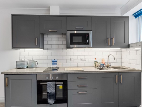 Electric oven and hob, fridge with ice box, microwave, toaster and kettle
