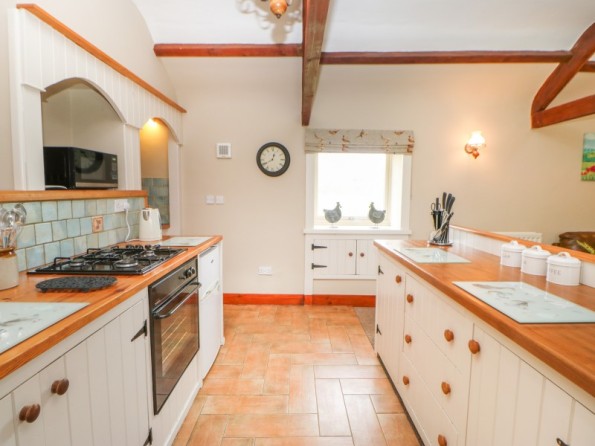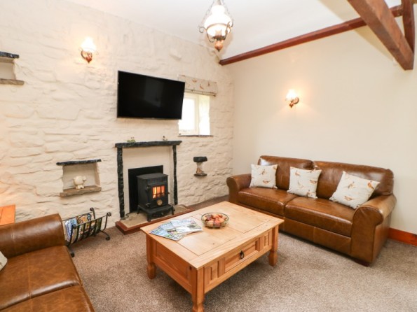 Two ground floor bedrooms: 1 x double, 1 x family room with three singles. Three piece modern bathroom, with a shower over the bath. First floor spacious beamed living area with kitchen, dining area and sitting area with coal-effect gas stove.