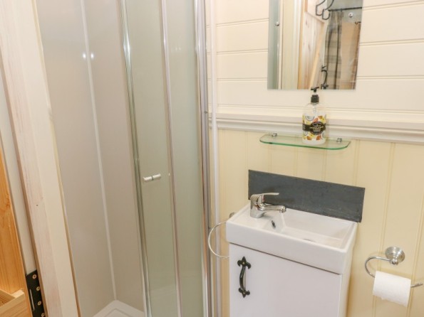 One bedroom: 1 x double within studio-style shepherds hut, with en-suite shower room with shower, basin and WC. Kitchen/dining space with woodburning stove.