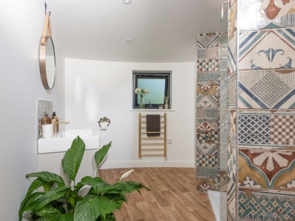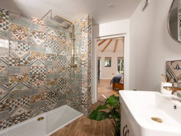 Gorgeous bathroom with feature tiles and large walk-in shower with rain head and handheld attachment, WC, heated towel rail and wash basin