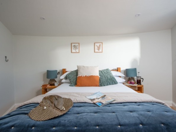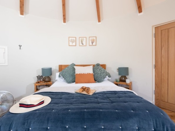 Positioned beneath the huge skylight in the main room of the roundhouse, the hand made double bed has under bed storage on caster wheels, two bedside pedestal tables and lamps as well as wall hooks for hanging clothes