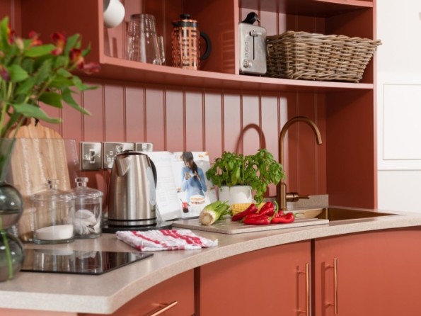 The modern kitchenette features an earthy pink scheme with copper accents and has an induction hob, oven, fridge with freezer compartment, kettle and cafetiere as well as a selection of glasses, crockery, cookware and utensils
