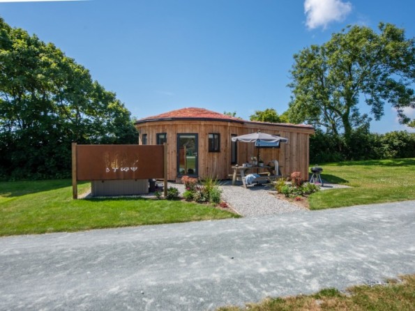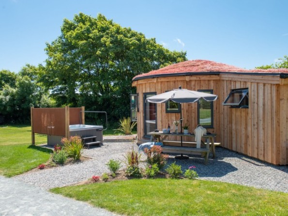 To the front of the roundhouse is a private area laid with Cornish stone gravel and lawn. A picnic bench for outdoor meals, charcoal BBQ and an electric hot tub that sits partially hidden behind a large metal screen
