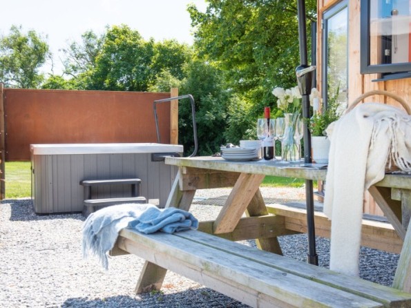 Inside, the space is bright and airy thanks to the open-plan layout, high ceiling and large port hole skylight. Tactile soft furnishings, printed artwork and rustic design elements accent the space, while shades of blue as well as natural tones lend a bespoke edge. A second separate double bedroom offers privacy and versatility for couples or groups travelling with children, while the shower room with its big walk-in cubicle is spacious, light and bright. Outside to the front of the lodge you’ll discover an alfresco dining area as well as your very own hot tub which sits behind a locally crafted metal privacy screen; perfect for daytime dips in the sunshine while the meat sizzles away on the BBQ or long lazy soaks at night under a blanket of stars.