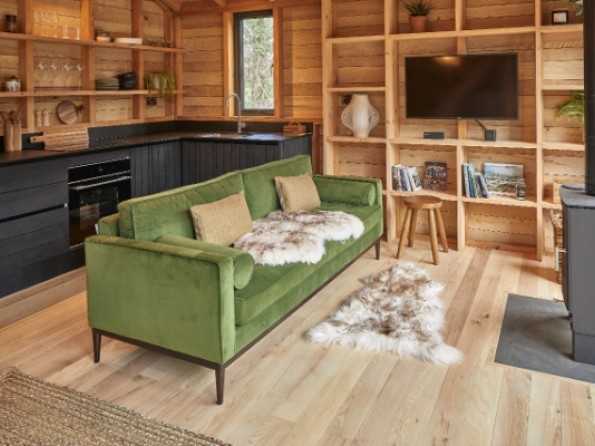 Inside the treehouse is luxurious and very cosy. There’s a woodburner as well as separate heating and the floor to ceiling glass doors mean that you can gaze at the views from all vantage points. There is a super king size bed on the mezzanine floor with a large window. The kitchen area is well equipped with oven, hob, fridge (with freezer compartment) and dishwasher, and there is a fully fitted bathroom with rainforest shower. There is fibre broadband. In front of the log burner is a comfy sofa, and there’s a small dining table and chairs for eating at. A range of books and games for you to enjoy. All bed linen, towels, and toiletries are provided, as well as a kitchen with the cookware you need to create a decent meal. Basics such as salt, pepper, sugar, oil and tea and coffee are provided. There’s also a basket of starter logs, kindling & firelighters for the woodburner.