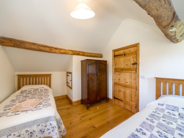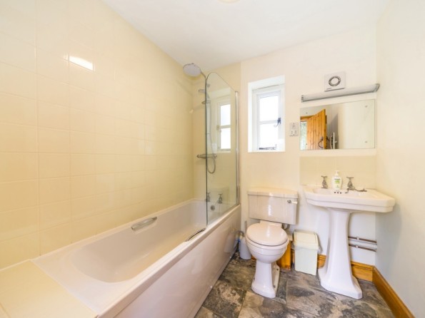 Two bedrooms: 1 x double, 1 x twin. Ground floor bathroom with bath, shower over, basin and WC. Open plan living area with kitchen, dining area and sitting area with woodburning stove.