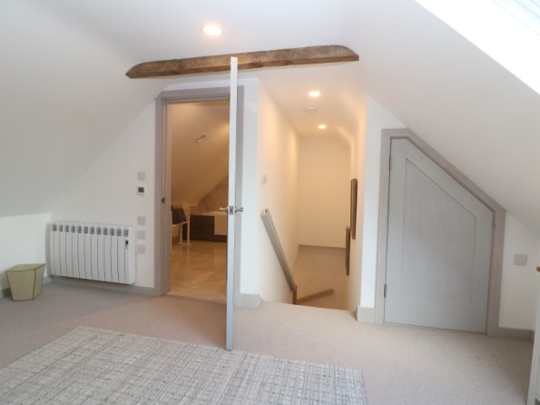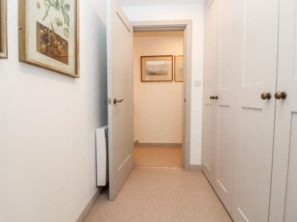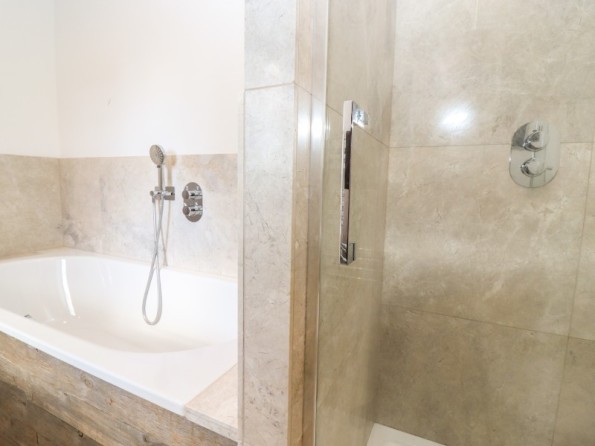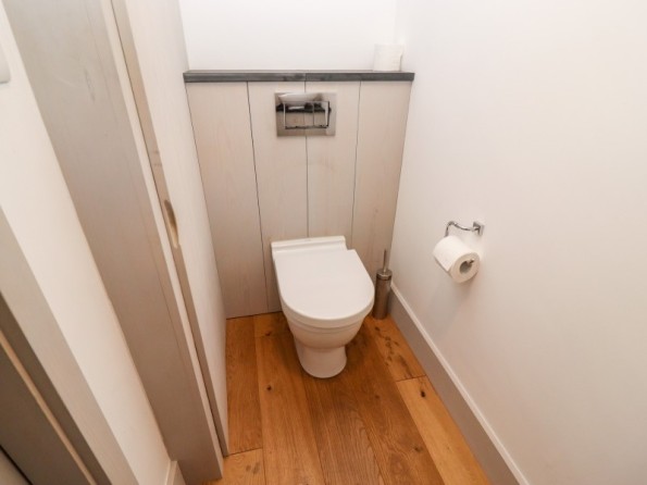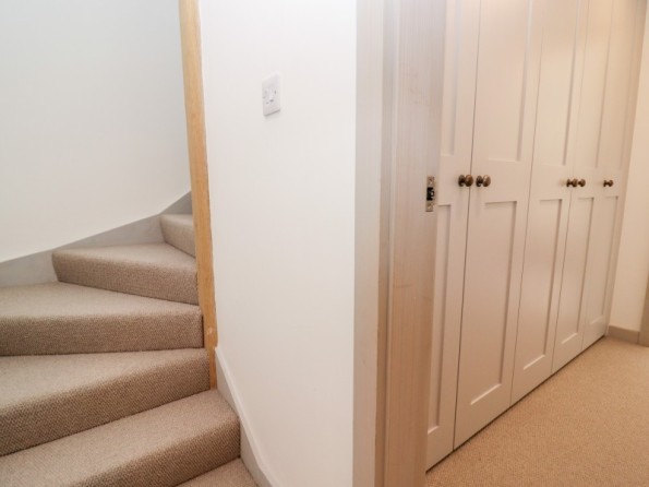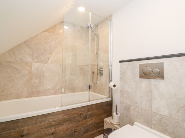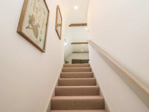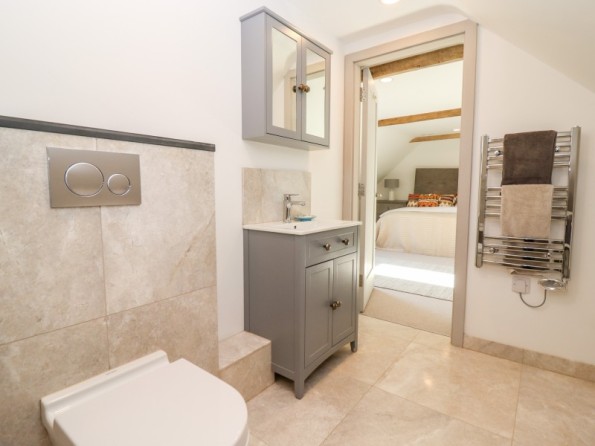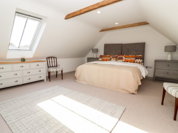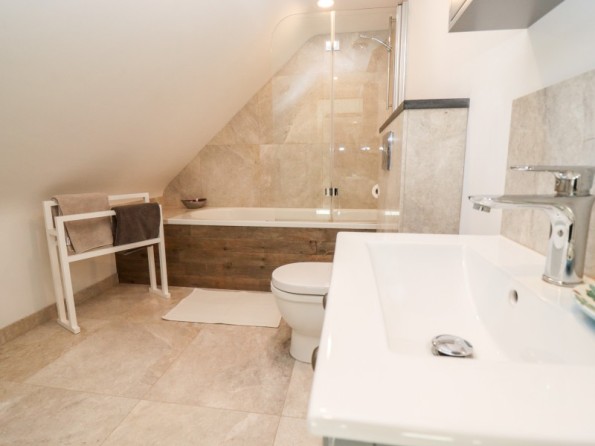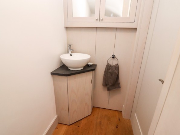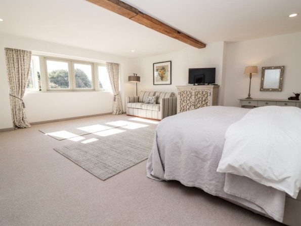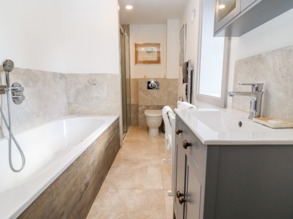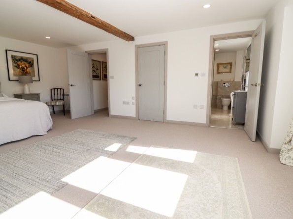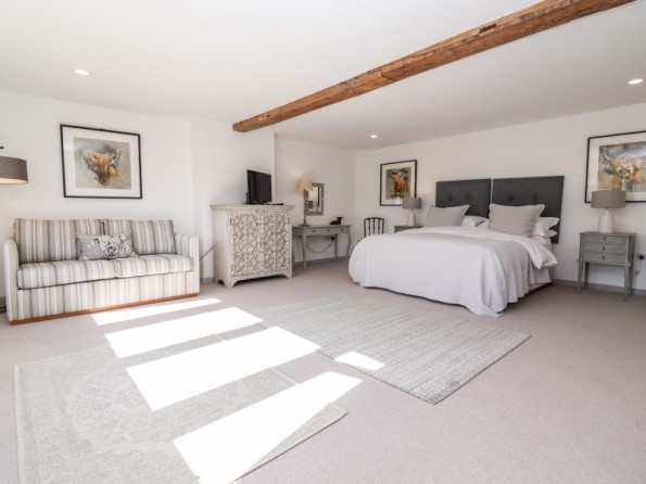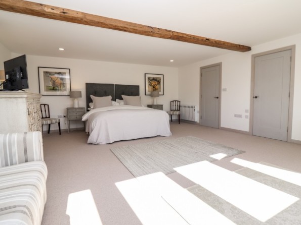 Over three floors. Two bedrooms: 2 x super-king-size (zip/link, can be twin on request) (one first floor with additional single sofa bed on request and one second floor) 1 x en-suite bath with walk-in shower, basin and WC, 1 x en-suite with shower over bath, basin and WC. Open-plan living space with kitchen, dining area and sitting area with woodburning stove. Cloakroom with basin and WC