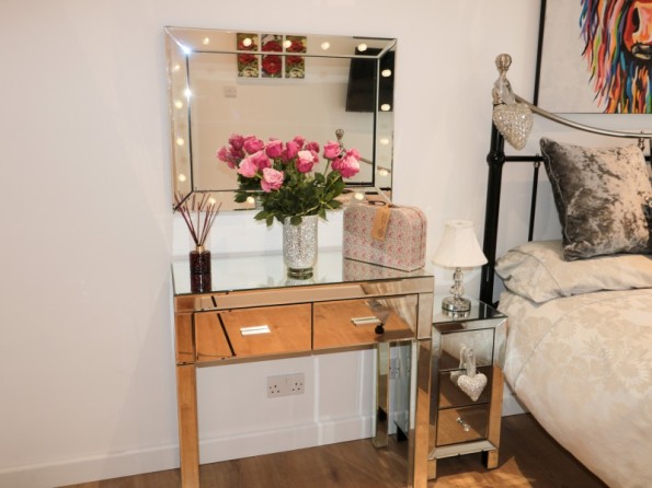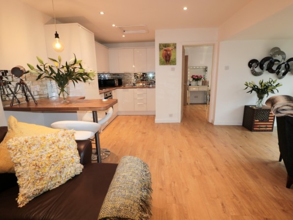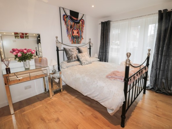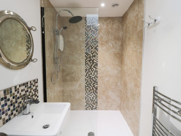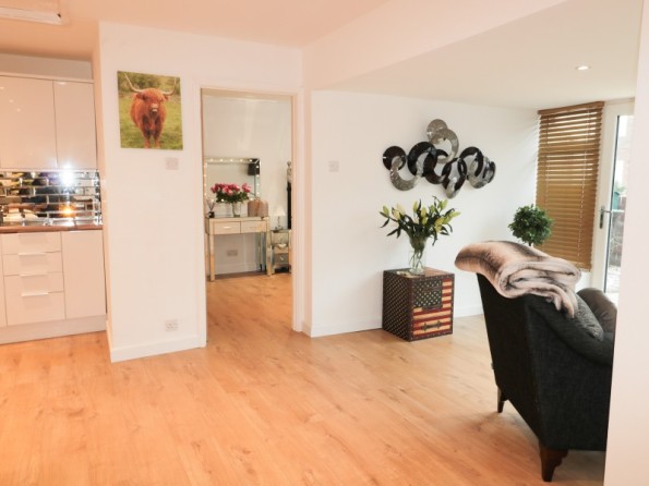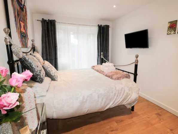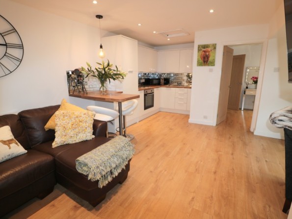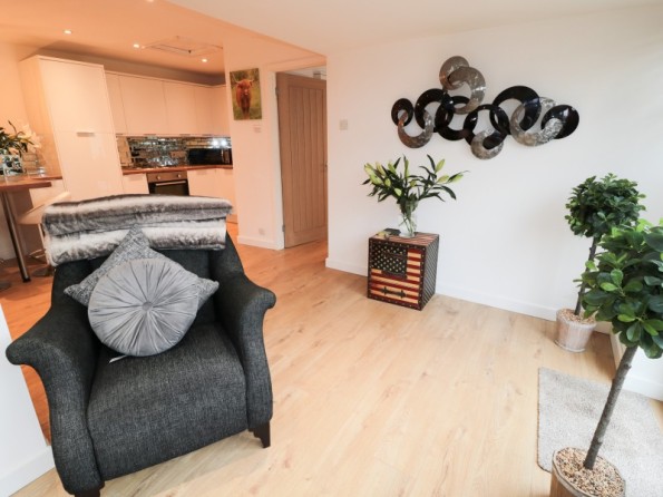 All-ground-floor. One bedroom with double bed, TV and en-suite walk-in shower, basin, heated towel rail and WC. Open-plan living space with kitchen, dining area and sitting area