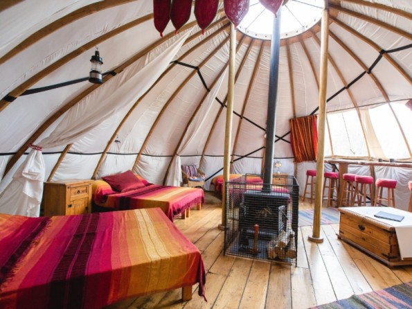 Also on site is a Mongolian Ger, a Bentwood Yurt (Kazakhstan), a Lavvu (Scandinavian) and a Native American Tipi, each of which has its own 'space', separated by mature shrubs and trees, and all connected by hand-made stepping stones. The Alachigh (pronounced Al-la-cheeg) is traditionally used by a nomadic tribe, the Shahsavan, from northern Iran. We've made the Alachigh ourselves (it took about six months) sourcing the oak timbers locally and steam-bending them to form a curve which connects the crown to the oak floorboards. We have covered this wooden framework in a stone coloured 12 oz canvas and adorned the inside with a marquee lining, together with 'drapes' which give a little privacy between the beds and creates a soft and homely atmosphere.