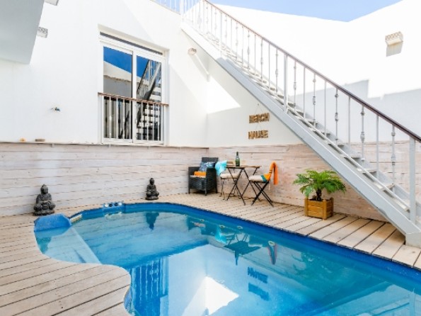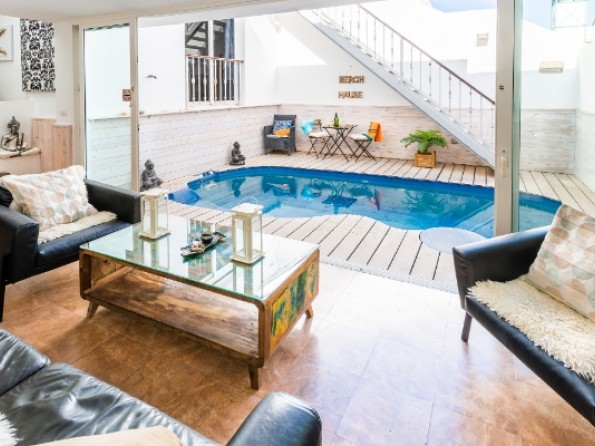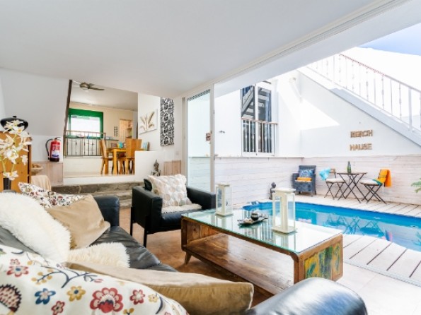 Tucked away in a quiet residential area yet less than a minute from the beach, The Beach House is a stylish and contemporary adults only (18+) private villa on the main beach in Costa Teguise in Lanzarote where you can relax on the roof terrace, dip into the plunge pool and enjoy peaceful surroundings and sea views.