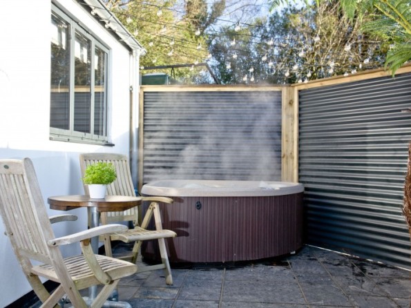 Tucked away in a corner of the private patio area is a bubbling hot tub and bistro table with seating; perfect for al fresco dining, or for enjoying a glass of wine together under the night sky.