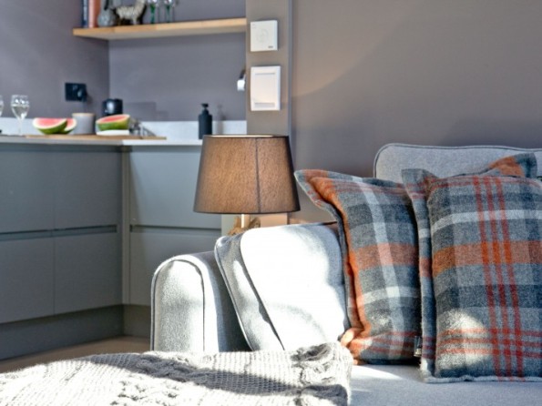 A two seater L shaped sofa, wood burner, coffee table, wall mounted Smart TV with Netflix, Bluetooth speaker