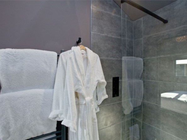 Walk in shower, wash basin, WC, heated towel rail and bathrobes.